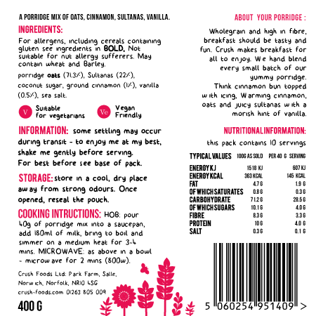 Wholegrain and high in fibre, breakfast should be tasty and fun. Crush makes breakfast for all to enjoy. We hand blend every small batch of our yummy porridge. Think cinnamon bun topped with icing, Warming cinnamon, oats and juicy sultanas with a moreish hint of vanilla.