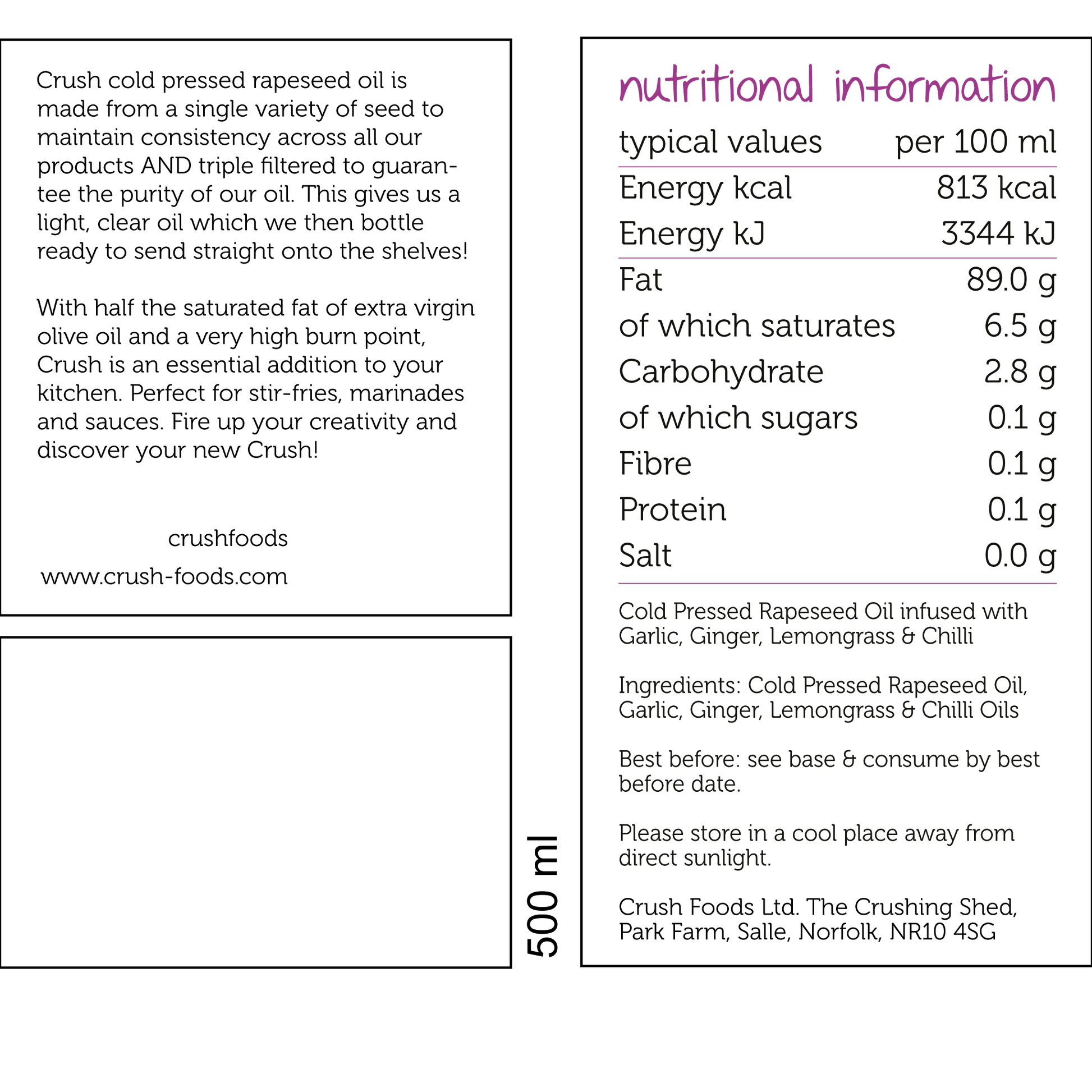 Lemongrass, Ginger & Chilli Oil - Crush Cold Pressed Rapeseed Oil, Lemongrass, Garlic, Chilli, Ginger.
