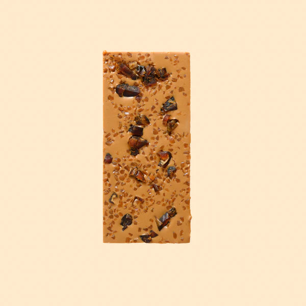 Crafted and tested by our very own expert chocolatier, this truly scrumptious chocolate bar gives everything, if not more than the traditional dessert! Rich caramel speckles and succulent organic date pieces add a final note to flavour and add a tempting bouquet to this luxurious and individually handcrafted chocolate bar delight.