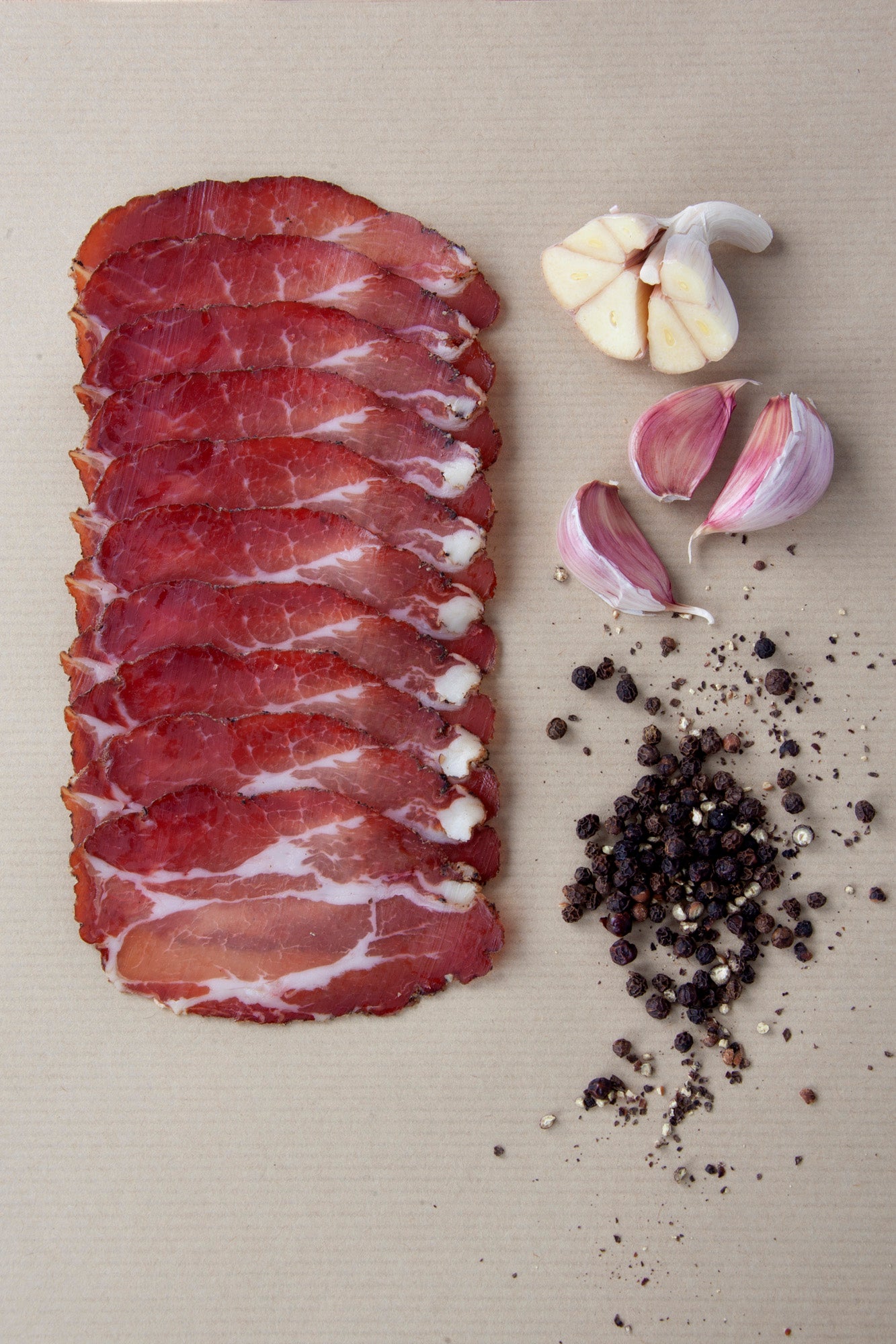 We only use lean cuts of local free-range pork in our coppa. Marinaded in garlic and black pepper then air dried for 10 weeks. Scoff with a hunk of bread and some wine for instant happiness.