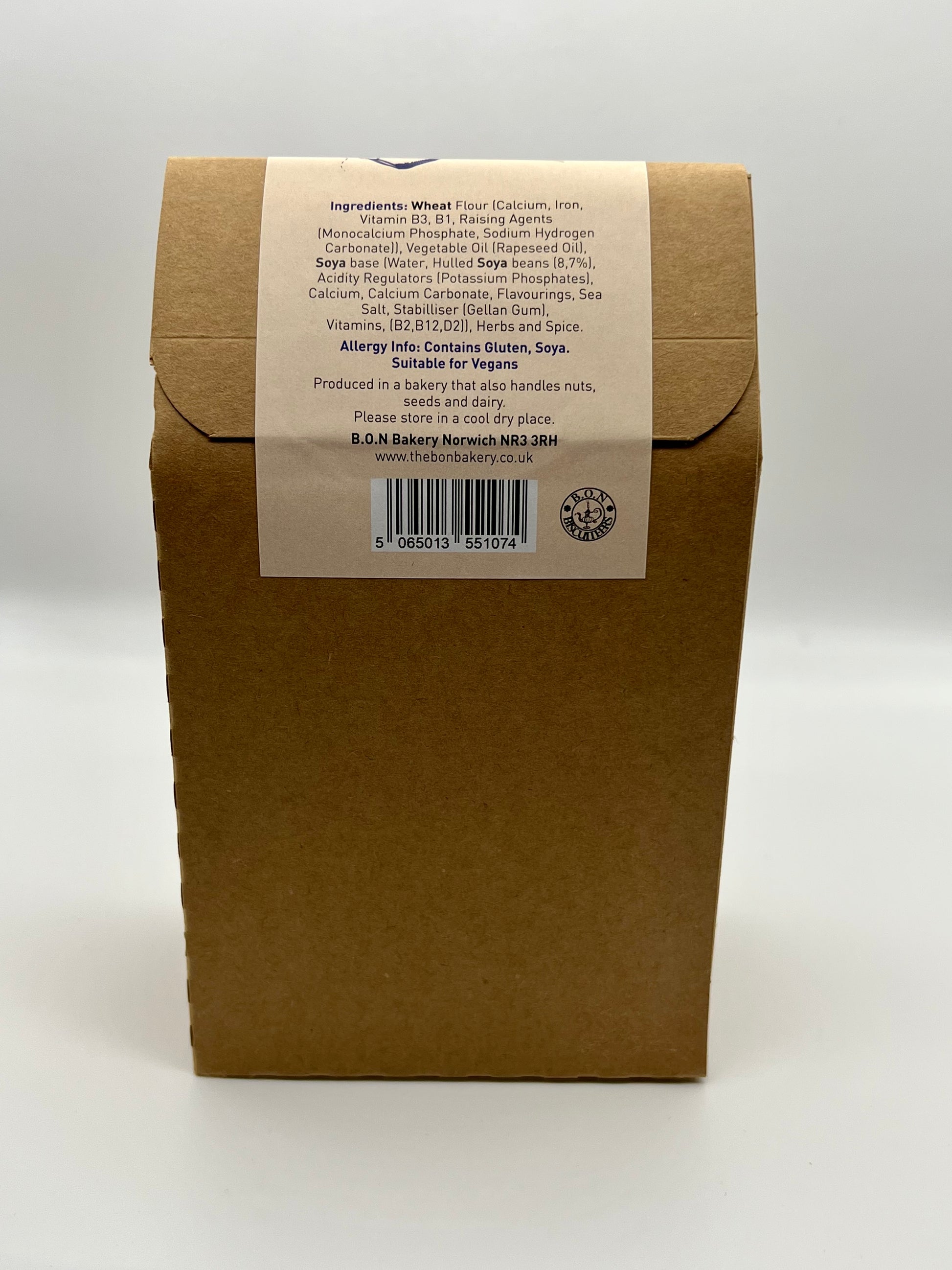 Ingredients: Wheat flour (Raising agent, Calcium Phosphate, Sodium Hydrogen Carbonate), Soya milk, Vegetable Oil, Herbs & Spice, Salt.