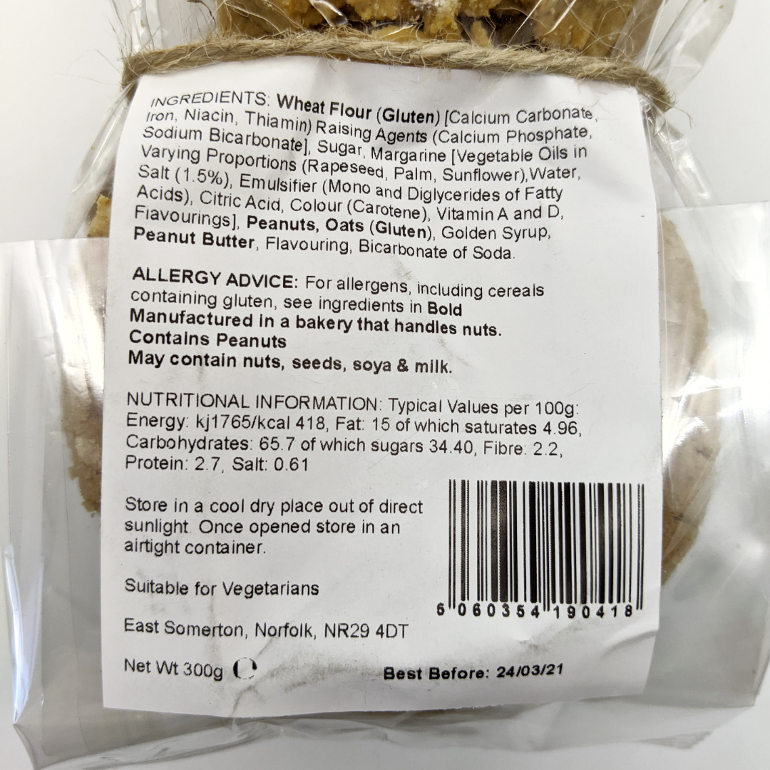 Wheat Flour (Gluten), Sugar, Margarine, Peanuts, Oats (Gluten), Golden Syrup, Peanut Butter (Peanuts), Flavourings, Bicarbonate of Soda.