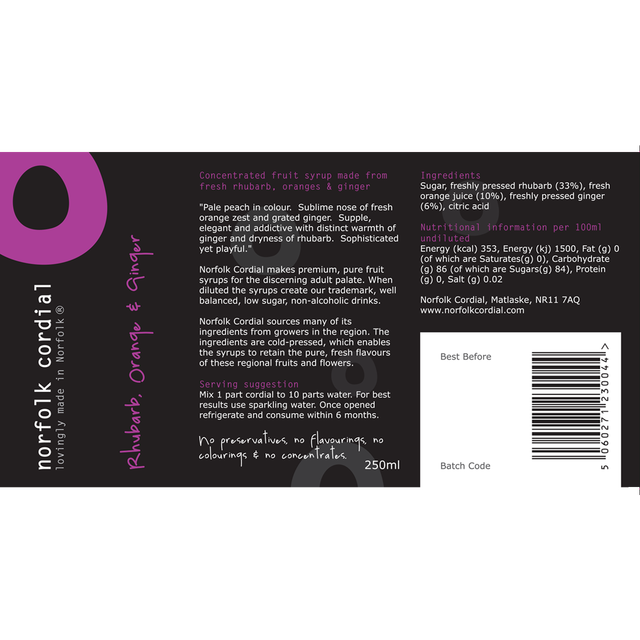 Norfolk Cordial's best seller. A sophisticated and intoxicating blend of dry rhubarb, warming ginger, and sweet orange, Norfolk Cordial's Rhubarb, Orange & Ginger cordial has an outstandingly pure and fresh taste, that is perfect in all seasons. From a roaring log fire to a scorching summer day, our Rhubarb, Orange & Ginger cordial will hit the spot!