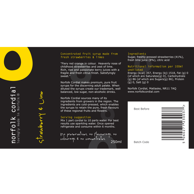 The true essence of summer! A flavour explosion of sweet, sun-ripened strawberries and that revitalising intensity of fresh lime, Norfolk Cordial's Strawberry & Lime cordial has an outstandingly pure and fresh taste, perfect for hot summer days, picnics, pool parties and BBQs.