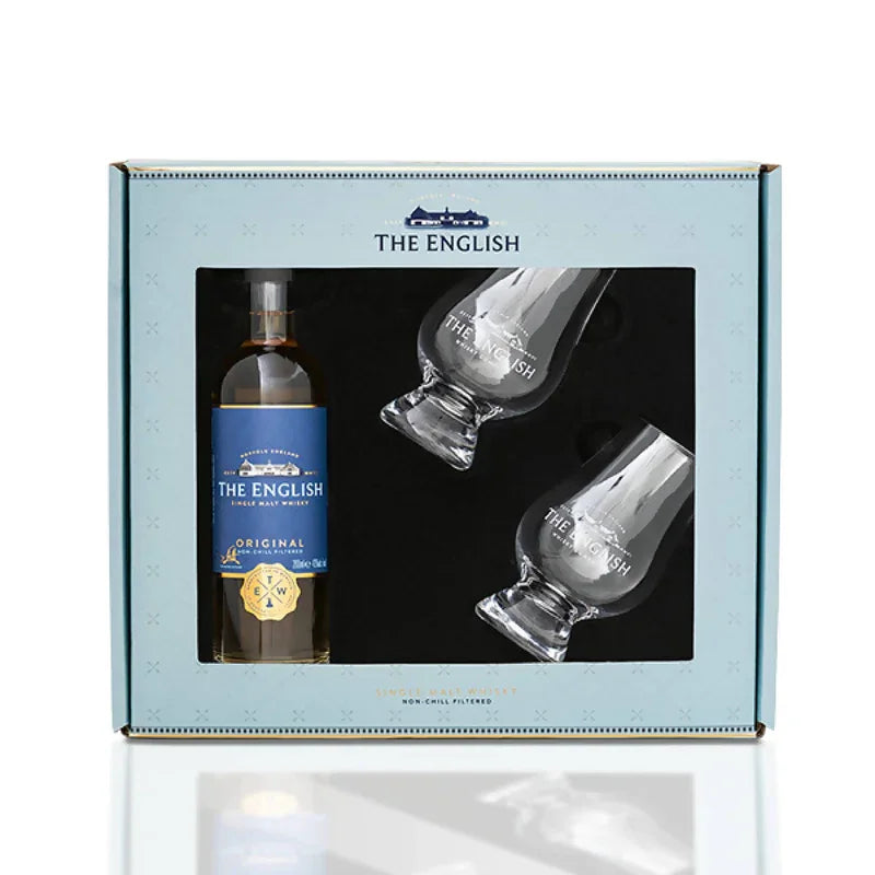 A 20cl bottle of each of The English Original & Smokey whiskies with two nosing glasses, each beautifully engraved with The English logo presented in a gift box. Perfect for a present!