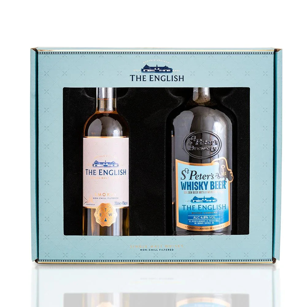 One 20cl bottle of The English Smokey and a bottle of 50cl St Peters English Whisky Beer presented in a beautiful gift box.